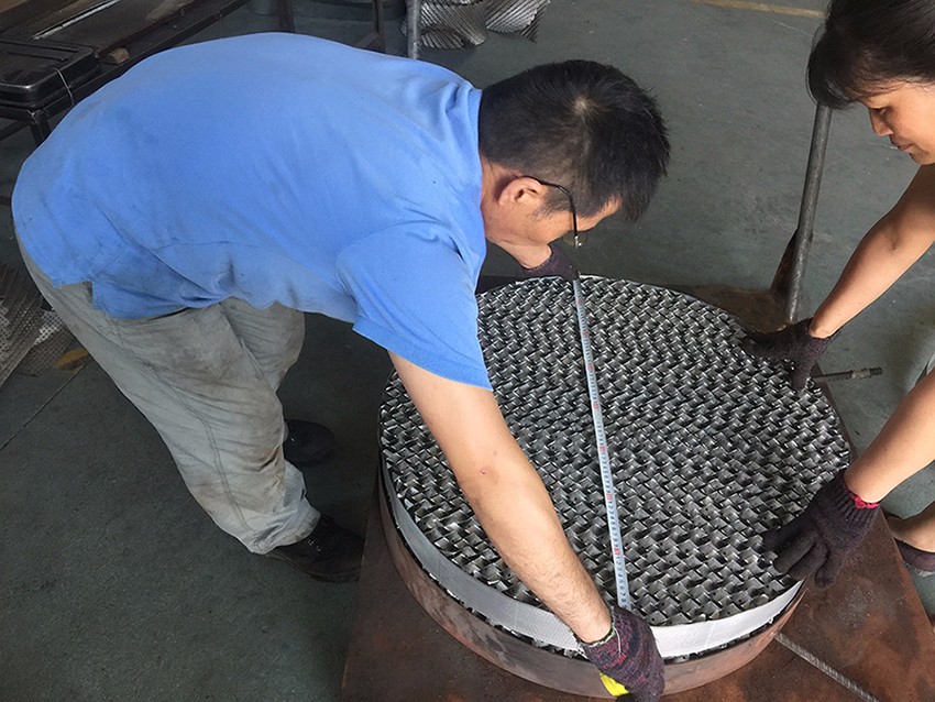 2017年7月間,氣溫高達40℃以上,在如此惡劣環(huán)境的情況下,我廠質量檢測人員在加工工人的配合下頂著酷暑對我廠加工產進行檢測。 我司規(guī)定,自動加工產品是對產品質量進行抽檢,半自動加工產品以及手工加工產品質則需對產品質量一一進行檢測。 SM250型直徑為810的孔板波紋填料為半自動手工加工產品,質量檢測人員核實孔板設計數據,檢測孔板波紋填料的實際直徑。對技術人員提出保證峰高估算距離合理性的建議,對加工工人提出保證每片孔板長度的精確度達到±0.5mm。以保證產品符合合同要求,保證滿足客戶所需,保證產品質量100%合格。
